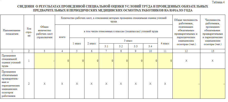 - Таблицу 5 со сведениями о результатах спецоценки условий труда и медосмотрах сотрудников переименовали в Таблицу4.