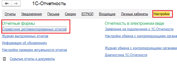 Затем через меню "Отчеты ー 1С-Отчетность ー Регламентированные отчеты ー Настройки" зайти в справочник регламентированных отчетов.