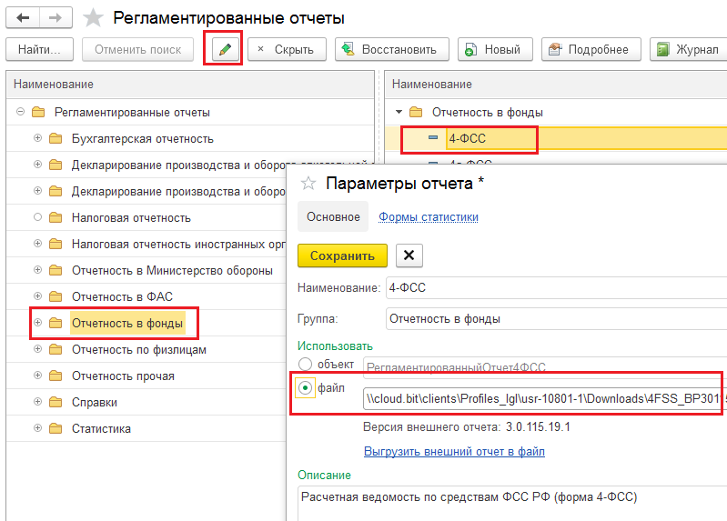 Выбрать форму 4-ФСС, нажать на верхней панели кнопку "Изменить", переключить настройку "Использовать" в положение "файл" и выбрать распакованный файл с внешним отчетом 4-ФСС.