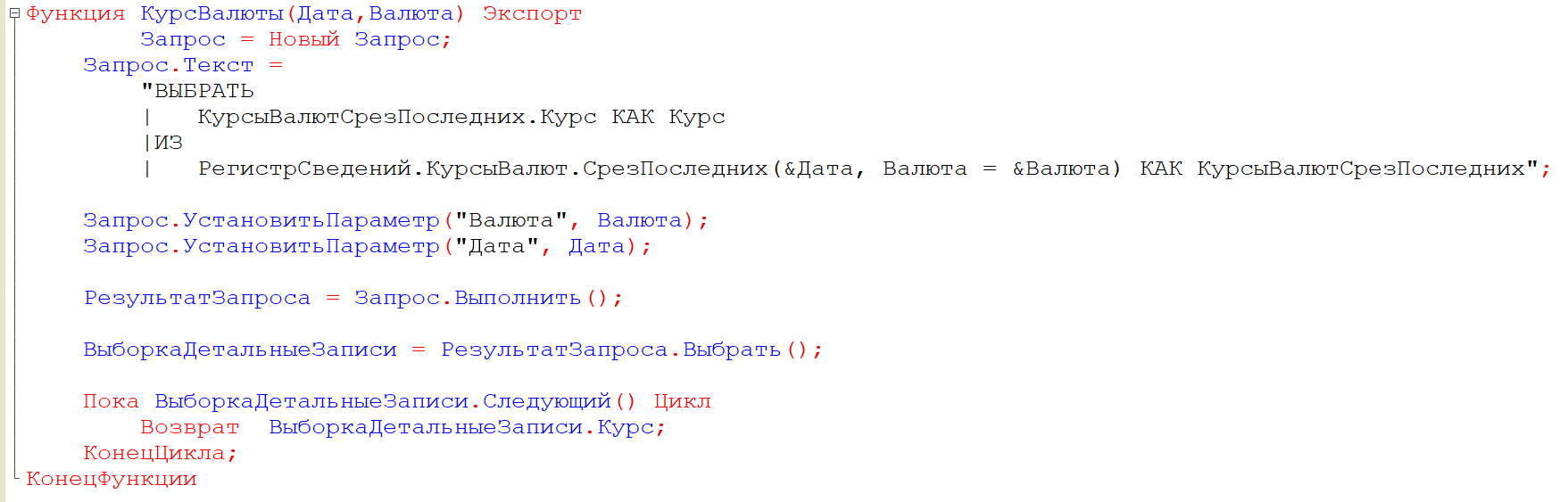 Создадим экспортную функцию в общем модуле, которая возвращает актуальный курс валюты