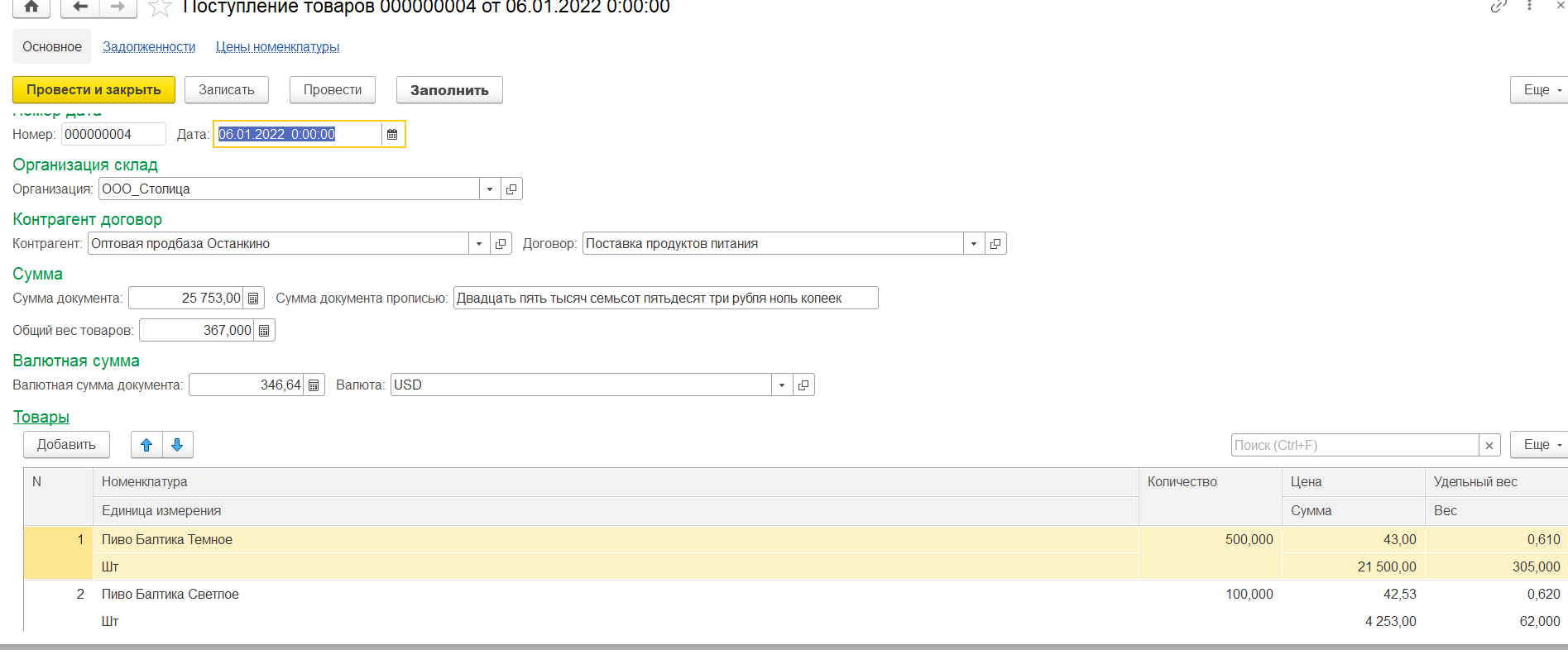 Заполним интерактивно реквизиты: контрагента-поставщика, договор, количество и цену поступившего товара.