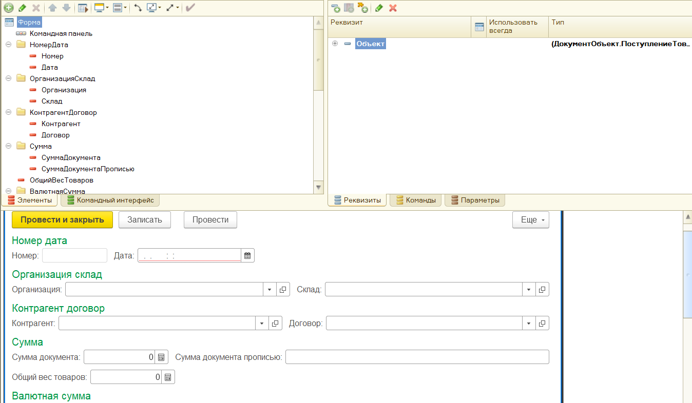Осталось теперь при записи документа заполнить реквизиты строк табличной части, в которых отражены поступившие товары, удалить строки с номенклатурой, которая не поступила и заполнить реквизиты шапки документа.
