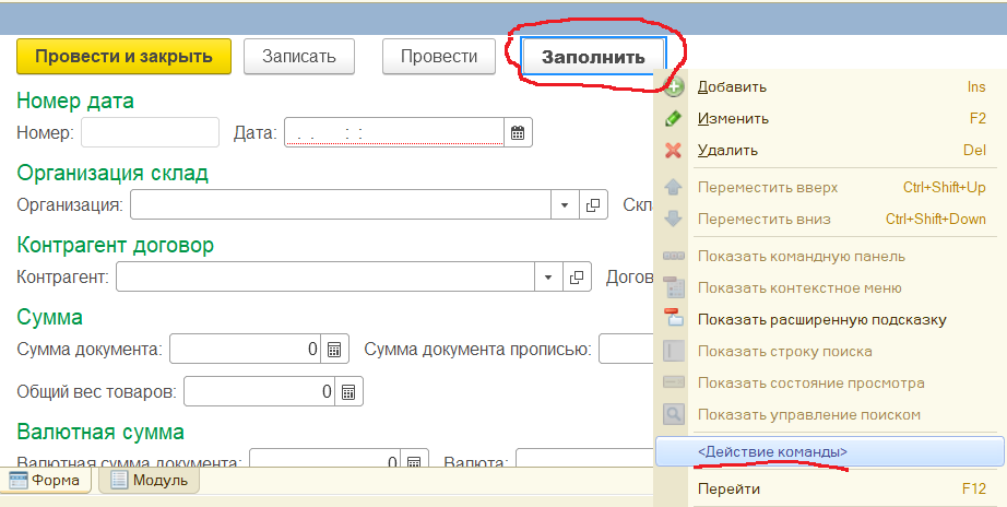 На форму добавим команду Заполнить, с помощью которой заполним табличную часть Товары документа.