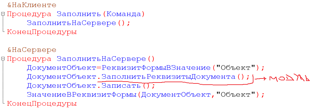 В модуле документа напишем экспортную процедуру заполнения реквизитов документа