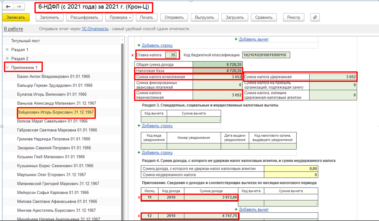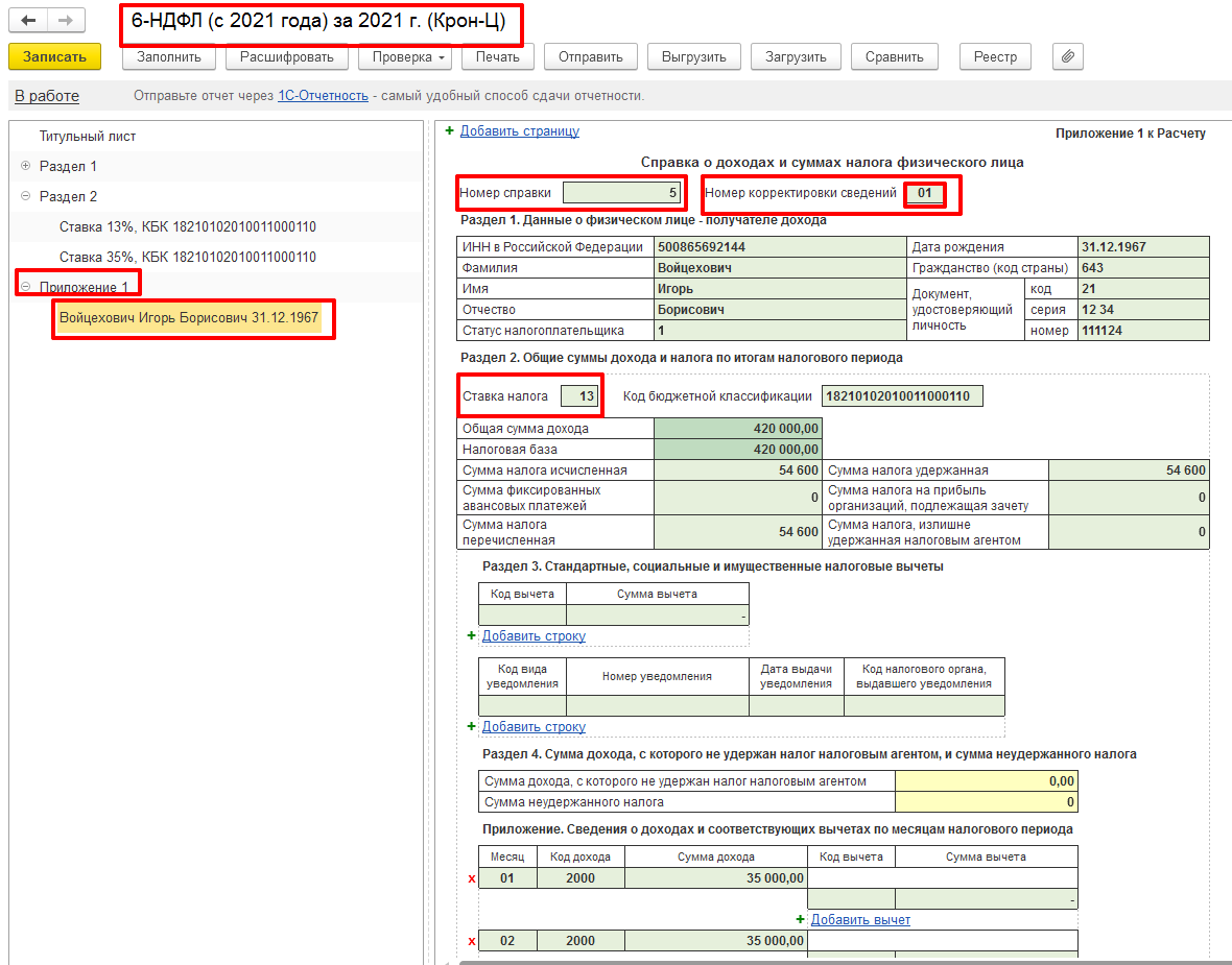 В Справке о доходах и суммах налога физического лица (Приложение 1 к Расчету 6-НДФЛ) доход и налог по Ставке 35 % отражаться не будет, заполняются данные только по Ставке 13%. Уточненный Расчет 6-НДФЛ за 2021 год представляется с корректирующими Справками только в отношении тех физических лиц, данные по которым уточняются. Справка заполняется с присвоенным ранее номером в первичном расчете (в поле «Номер справки»), в поле «Номер корректировки сведений» - указывается «01», если это первая корректировка за 2021 год по данному сотруднику.