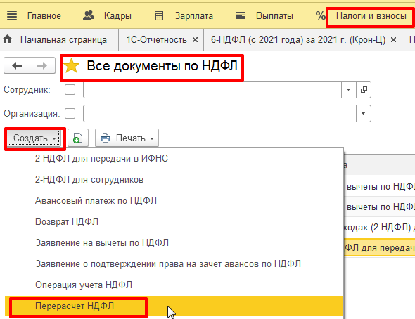 (Раздел – Налоги и взносы – Все документы по НДФЛ – кнопка «Создать» – Перерасчет НДФЛ).