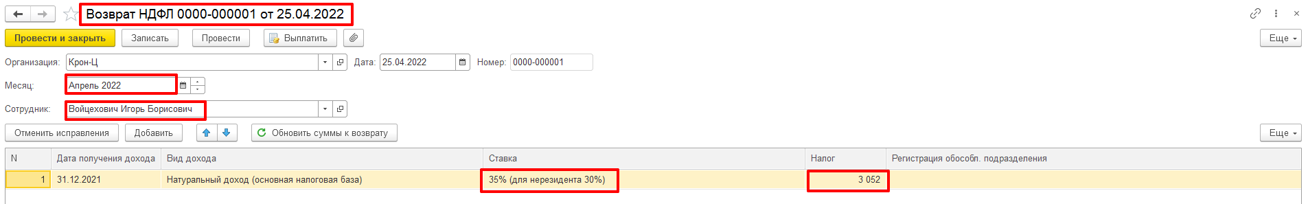 Возврат излишне удержанного НДФЛ будет отражен в Отчетности за тот период, когда его вернули сотруднику. В нашем примере НДФЛ вернули в Апреле 2022 года (в поле Месяц Документа «Возврат налога» указан месяц Апрель). Поэтому, он будет отражен в Разделах 1 и 2 Расчета 6-НДФЛ за полугодие 2022 года – в строке 190 Раздела 2 и в блоке строк 030 - 032 Раздела 1.