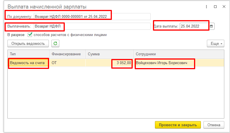 После получения от сотрудника письменного заявления, на возврат излишне удержанного НДФЛ, регистрируем документ «Возврат НДФЛ» (Раздел – Налоги и взносы – Возврат НДФЛ). Если в документе указано, что выплата будет произведена в межрасчетный период, то перечислить сумму возврата можно сразу, не дожидаясь ближайшей выплаты аванса или заработной платы.