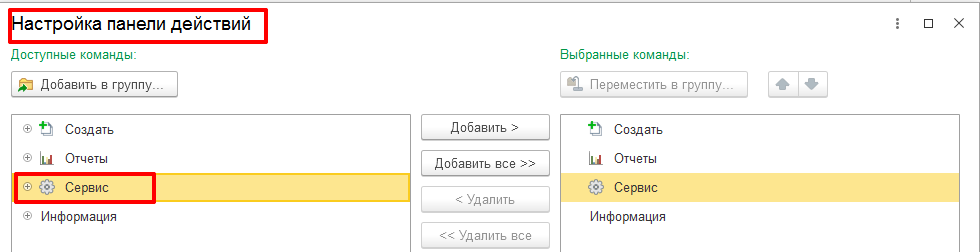 Раздел – Администрирование – кнопка «Настройки» – Настройка действий – Сервис – Описание изменений программы – Добавить – Ок.
